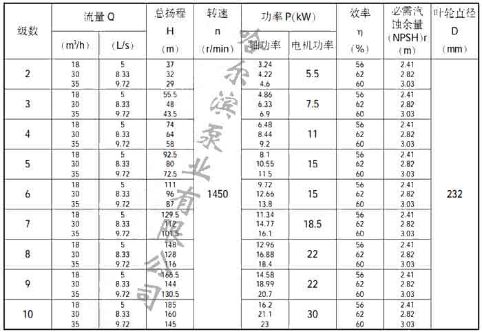 50DL型泵性能參數表